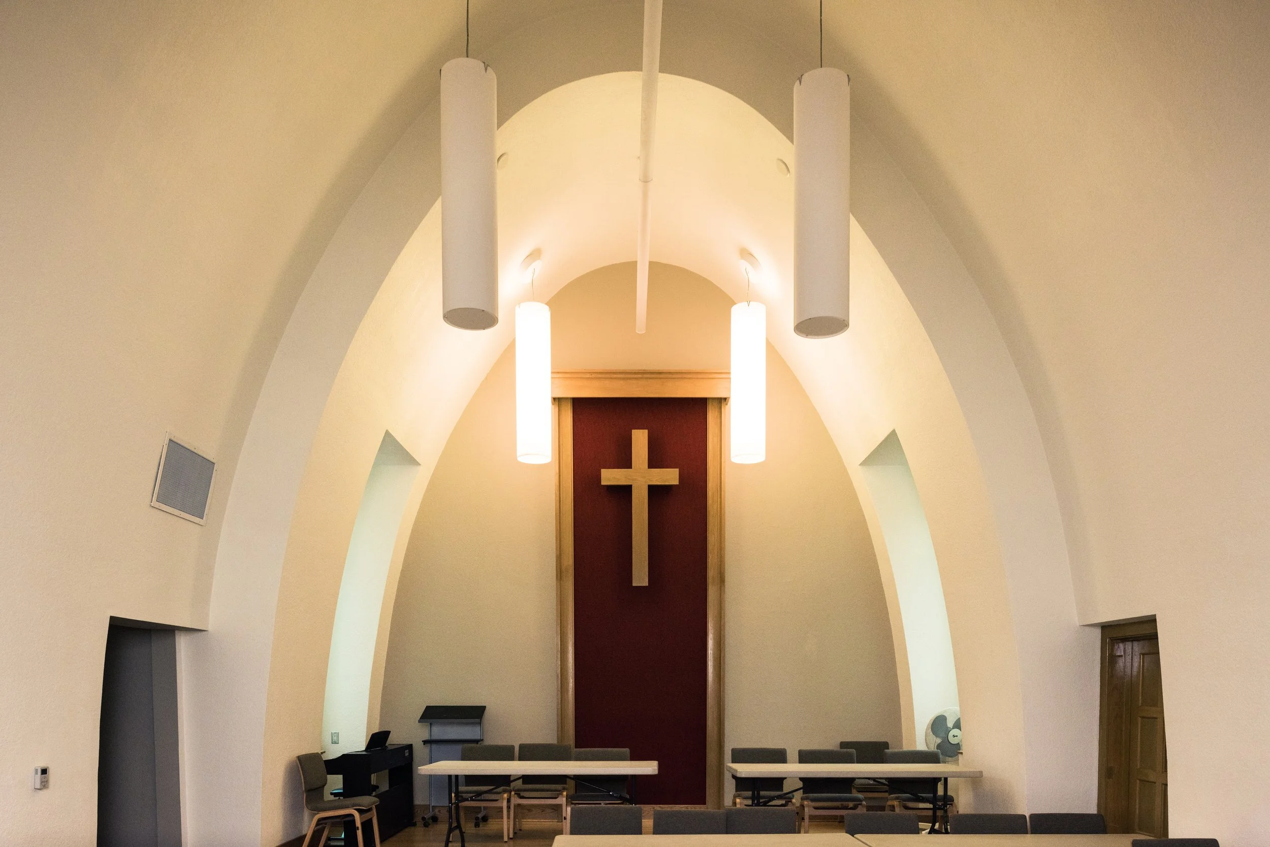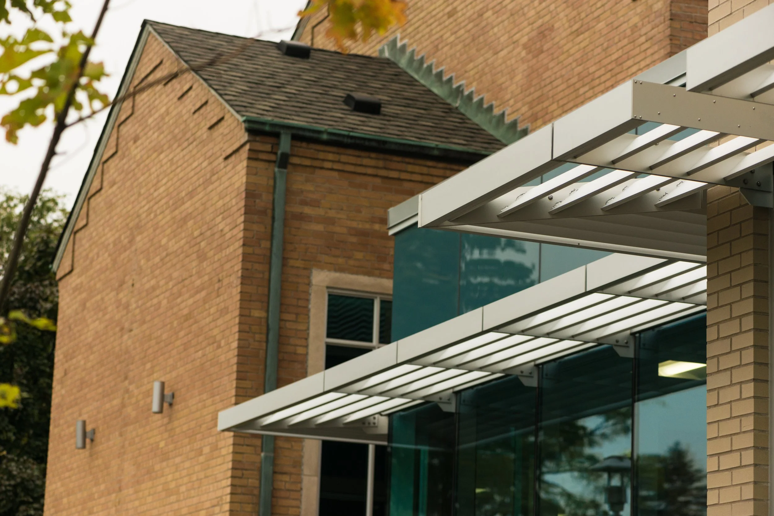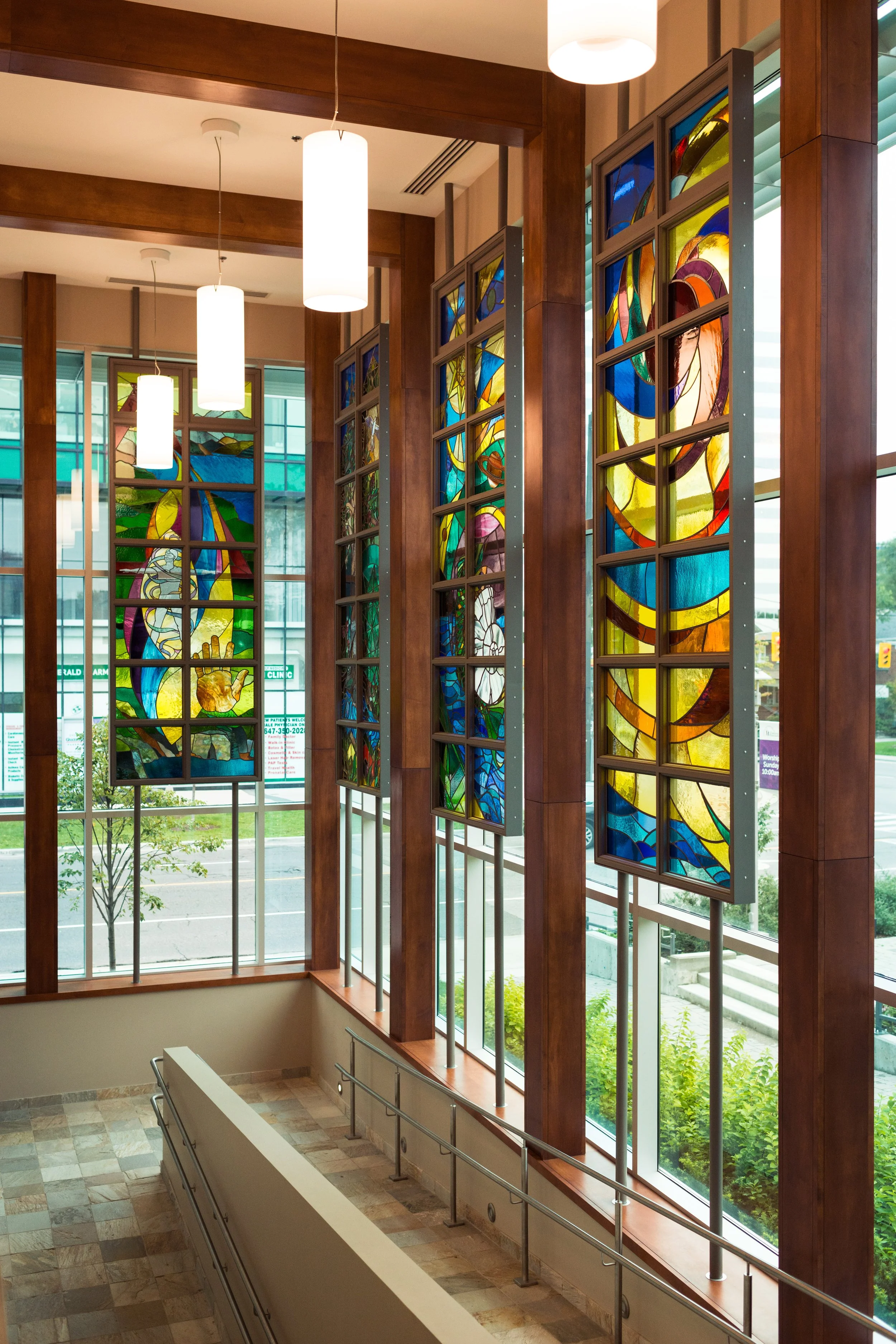 The site's unique characteristics inspired the arrangement of spaces and architectural elements. Situated at a bustling intersection adjacent to a community park, the property's design draws from its surroundings. The main entrance leads to a spacious mezzanine foyer, fostering informal gatherings and fellowship. A foldable partition separates the foyer from the sanctuary, accommodating overflow from the sanctuary when needed. Surrounded by curtain wall glass, the foyer is visible from two intersecting streets, creating a connection with the community. Pictorial stained glass windows, relocated from the former sanctuary, add a touch of colour, mediating the view between those inside and outside. This space, primarily south-facing, is often bathed in vibrant, natural light. On the north side of the addition, rooms with large windows provide captivating views of the park and daycare playgrounds below.