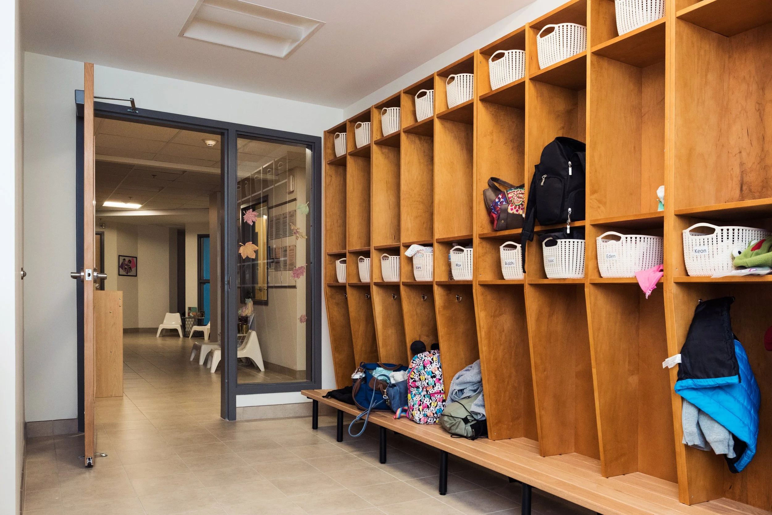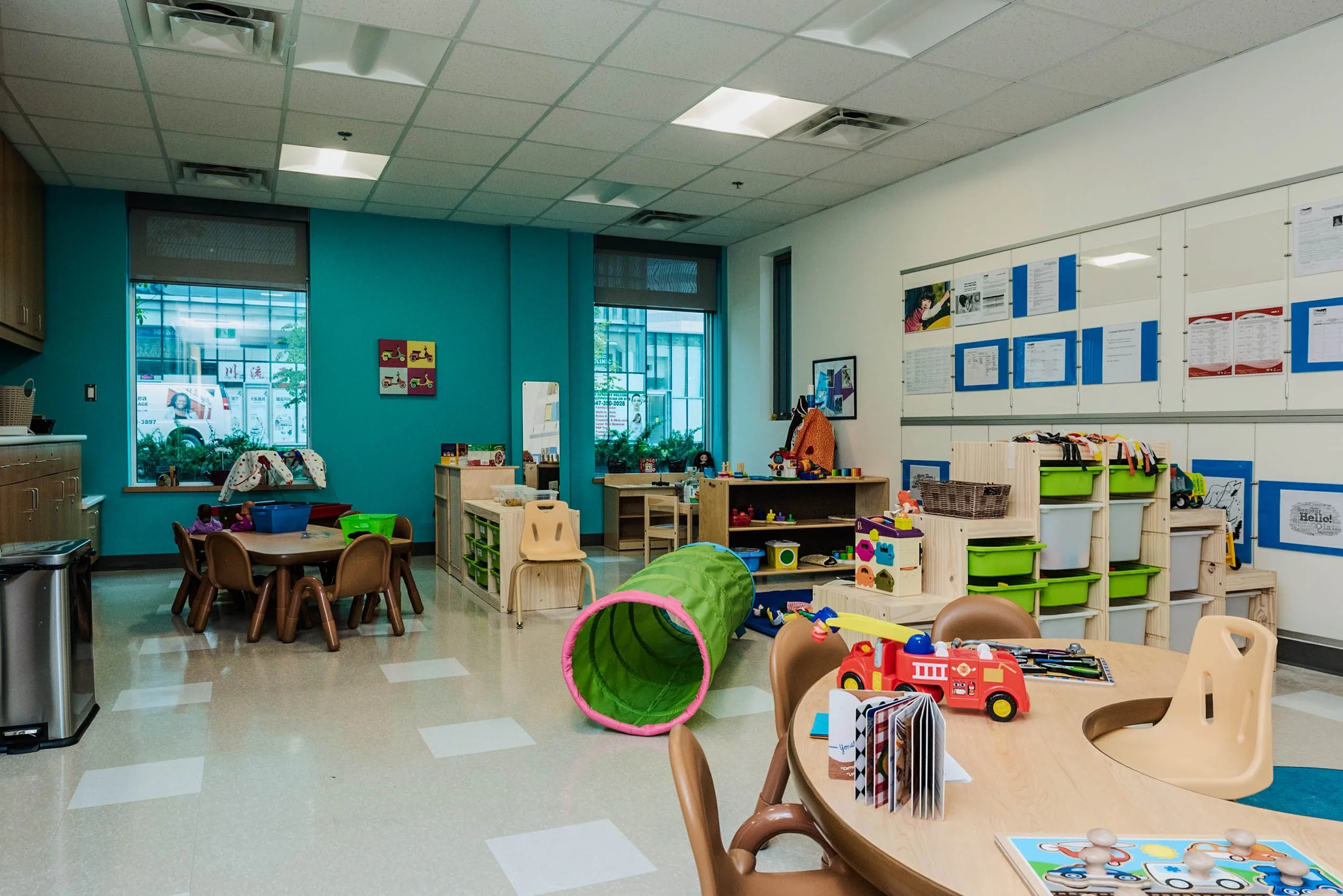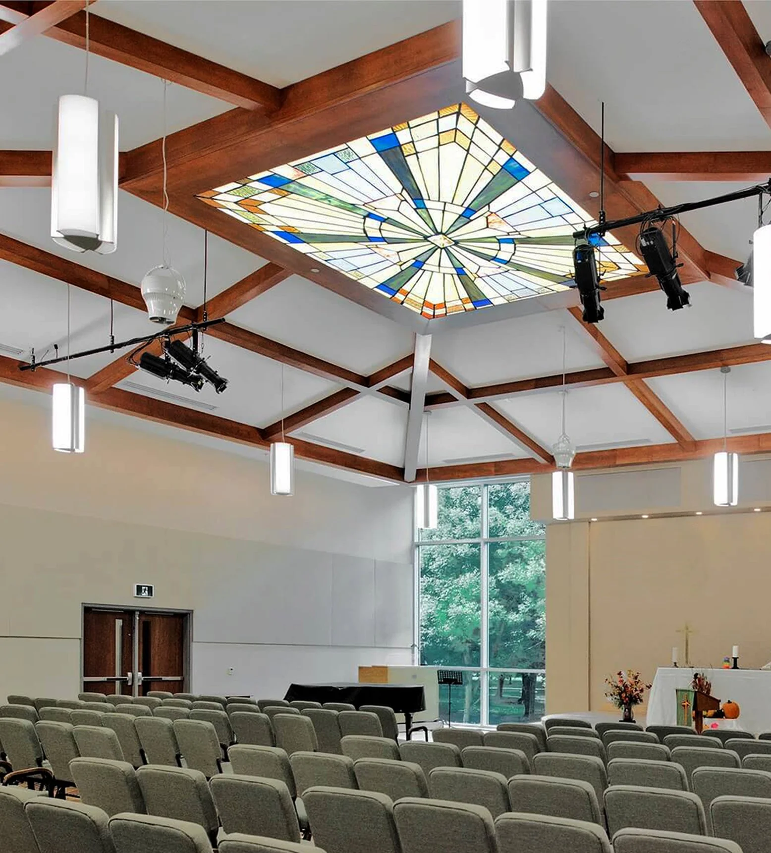 The site's unique characteristics inspired the arrangement of spaces and architectural elements. Situated at a bustling intersection adjacent to a community park, the property's design draws from its surroundings. The main entrance leads to a spacious mezzanine foyer, fostering informal gatherings and fellowship. A foldable partition separates the foyer from the sanctuary, accommodating overflow from the sanctuary when needed. Surrounded by curtain wall glass, the foyer is visible from two intersecting streets, creating a connection with the community. Pictorial stained glass windows, relocated from the former sanctuary, add a touch of colour, mediating the view between those inside and outside. This space, primarily south-facing, is often bathed in vibrant, natural light. On the north side of the addition, rooms with large windows provide captivating views of the park and daycare playgrounds below.