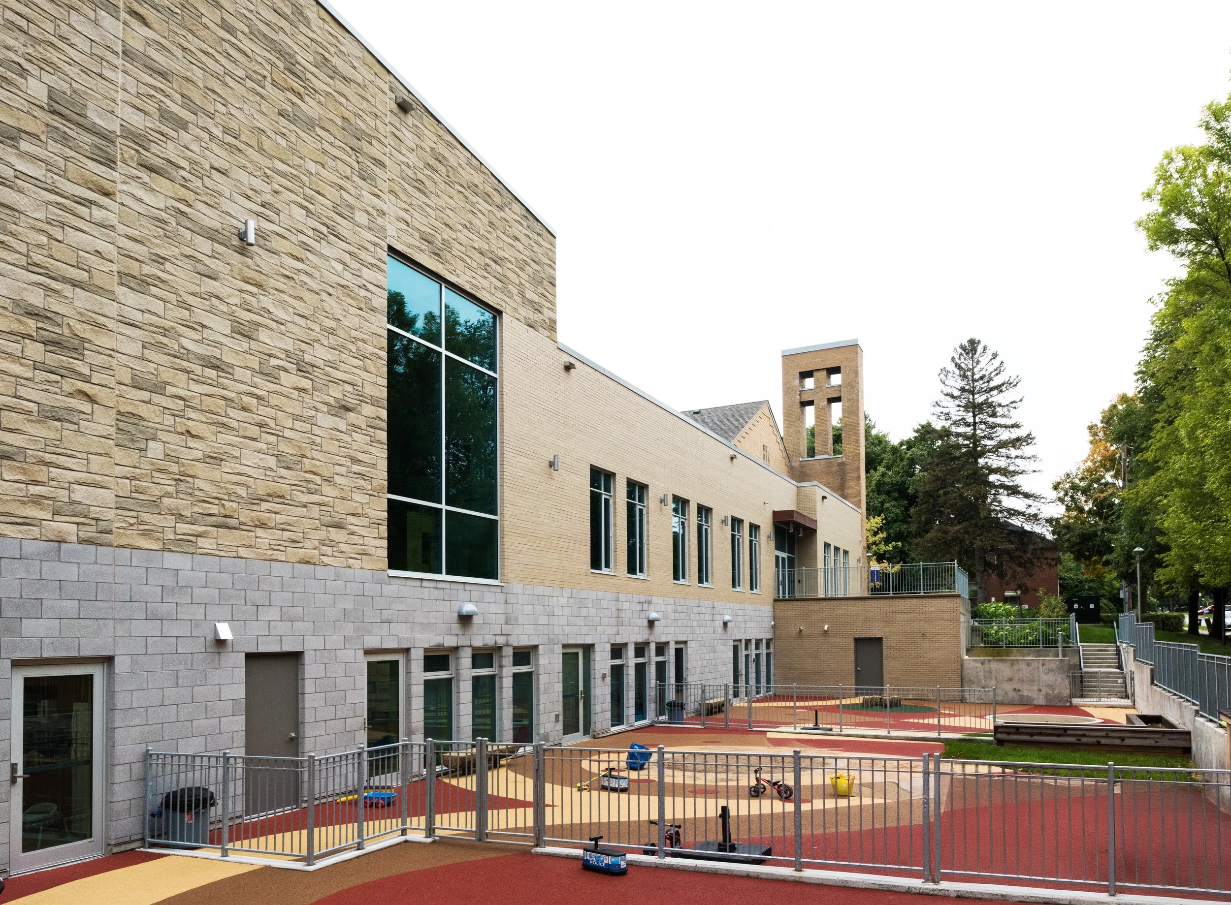 The redevelopment scheme aimed to restore the original building, transforming the sanctuary and basement into welcoming fellowship halls. For the aging addition, the most practical solution was a complete replacement with a two-story modern facility. This new structure would house a state-of-the-art sanctuary, a licensed childcare center, a food bank, a commercial kitchen, meeting/classrooms, and administrative spaces. Notably, an underground parking lot was incorporated into the addition, liberating outdoor space for a welcoming parkette by the entrance and accessible play yards adjacent to the daycare rooms.