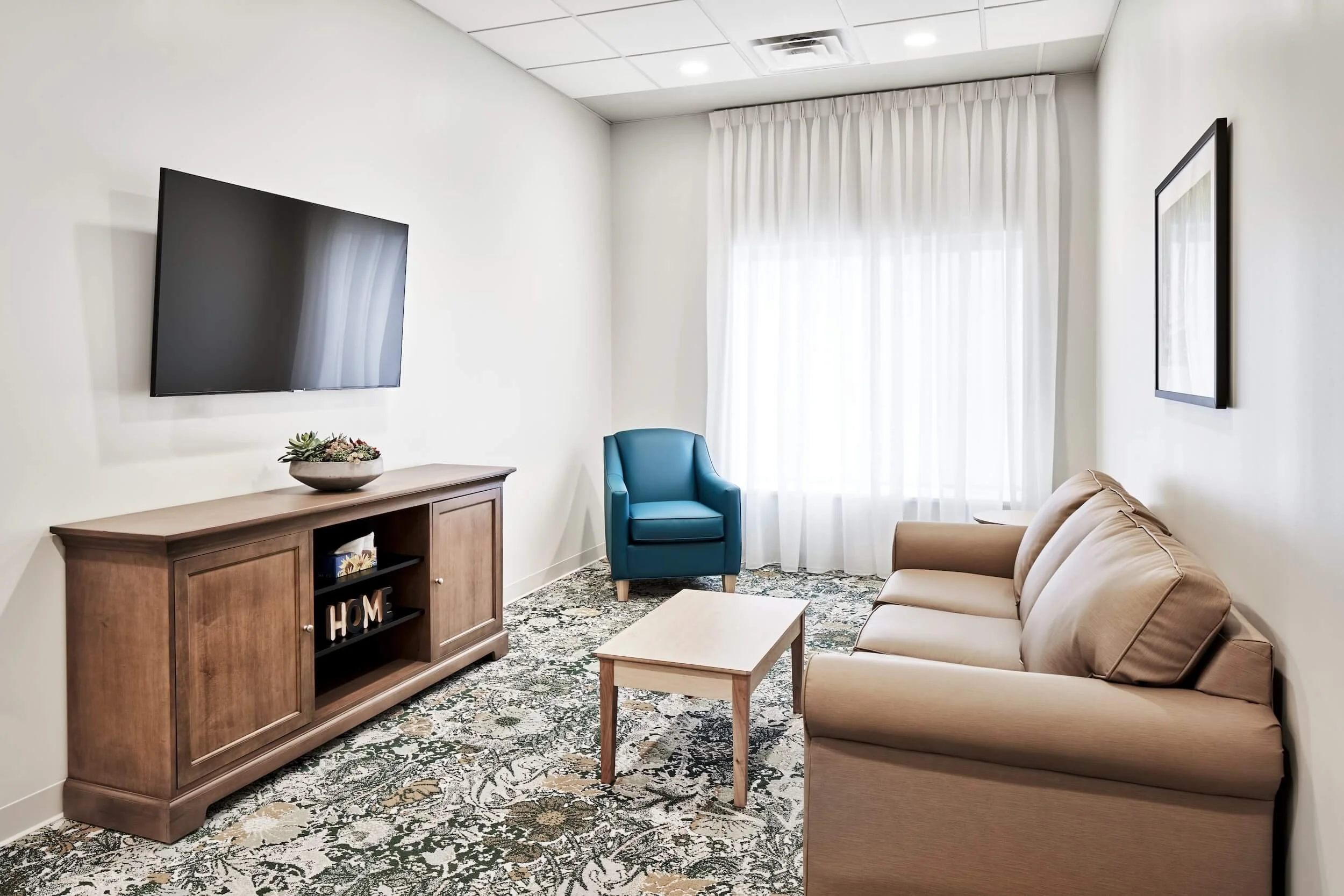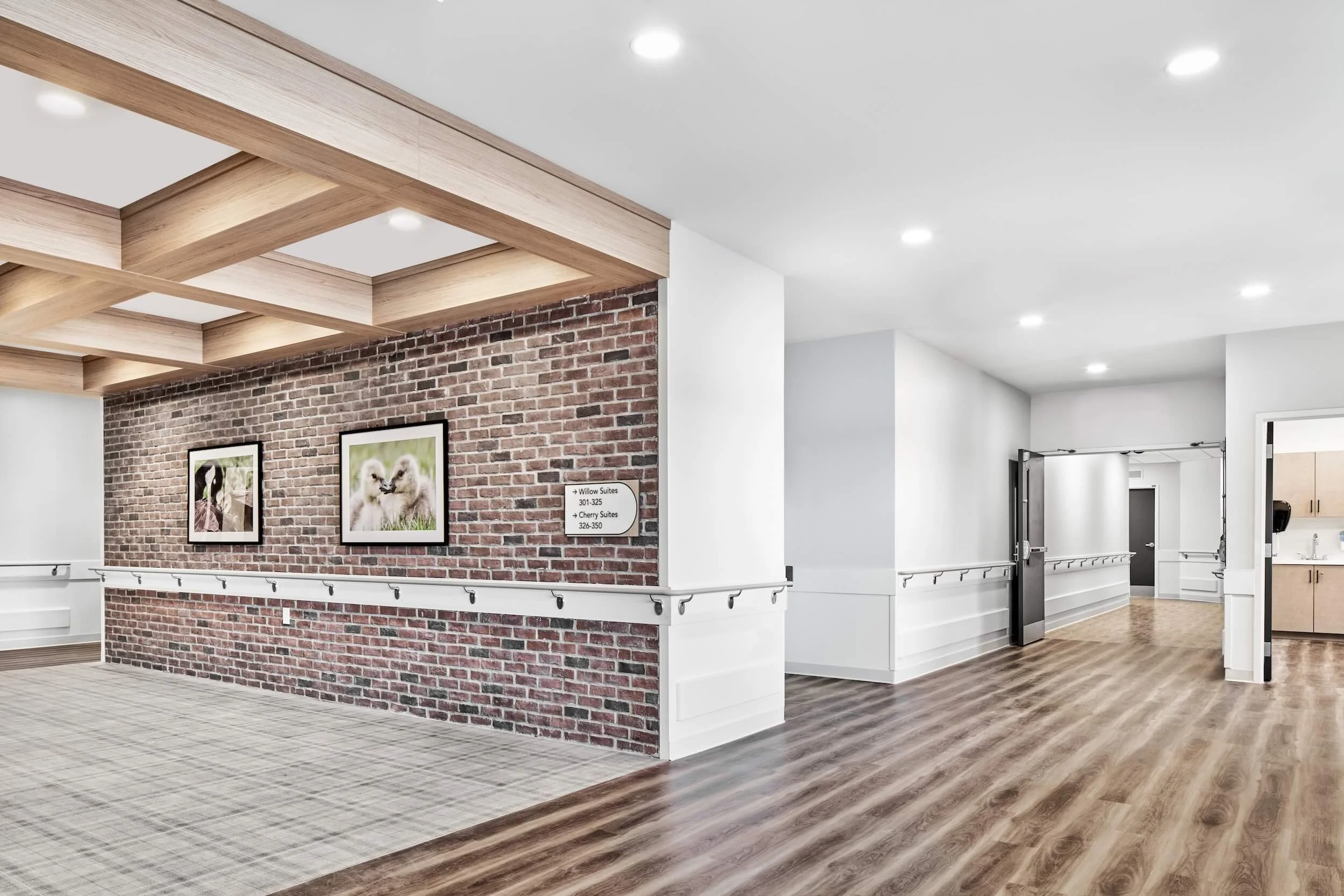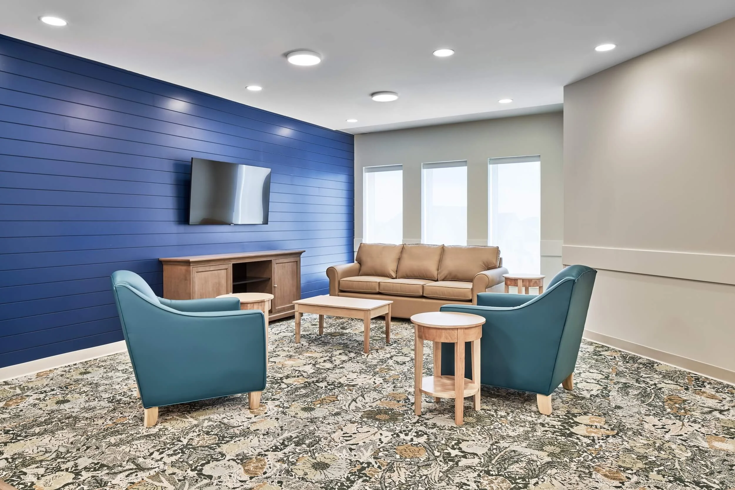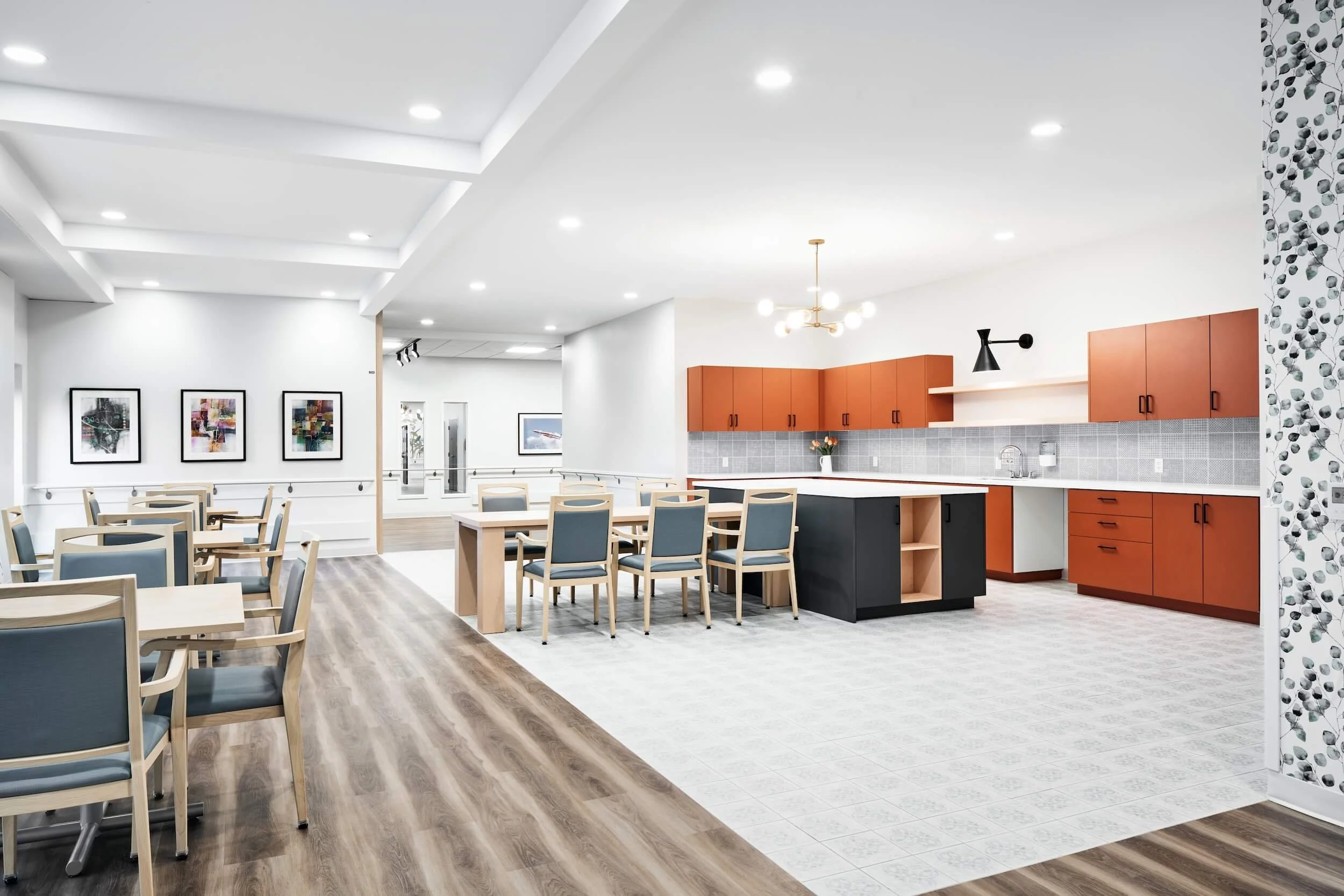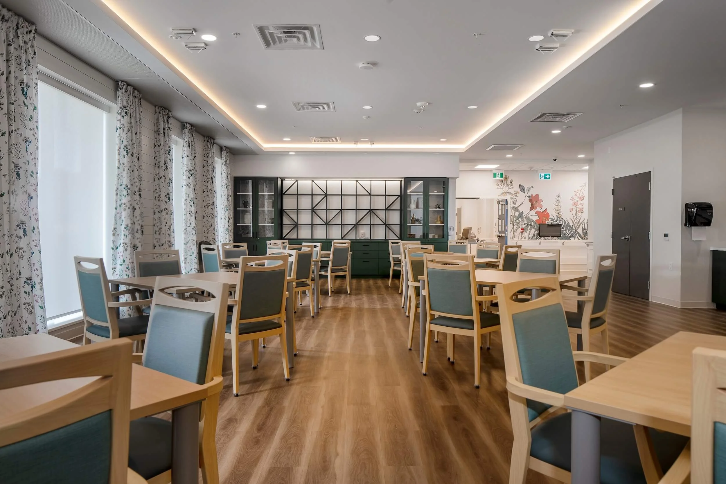 The facility, spanning 107,585 square feet, was meticulously designed to cater to residents' diverse needs, featuring sleeping rooms, common and activity areas, dining spaces, and essential care support spaces. Additionally, an 18,000 square foot wing was dedicated to building services, administrative areas, and staff support spaces, including reception areas, offices, meeting rooms, a staff lounge with a patio, as well as staff change and shower rooms.