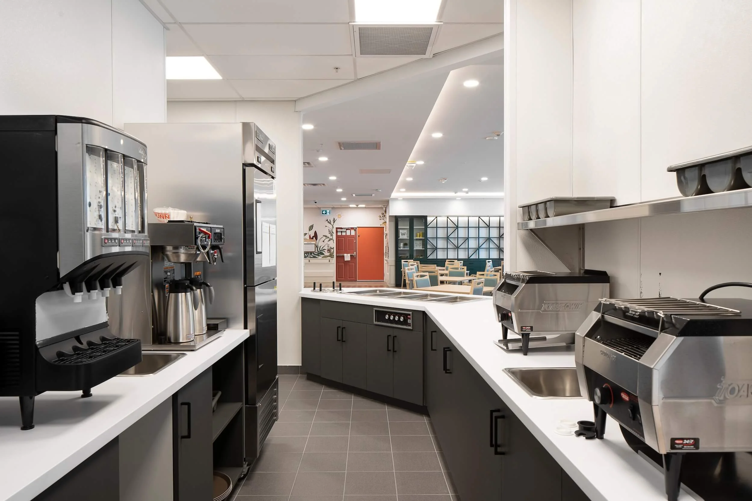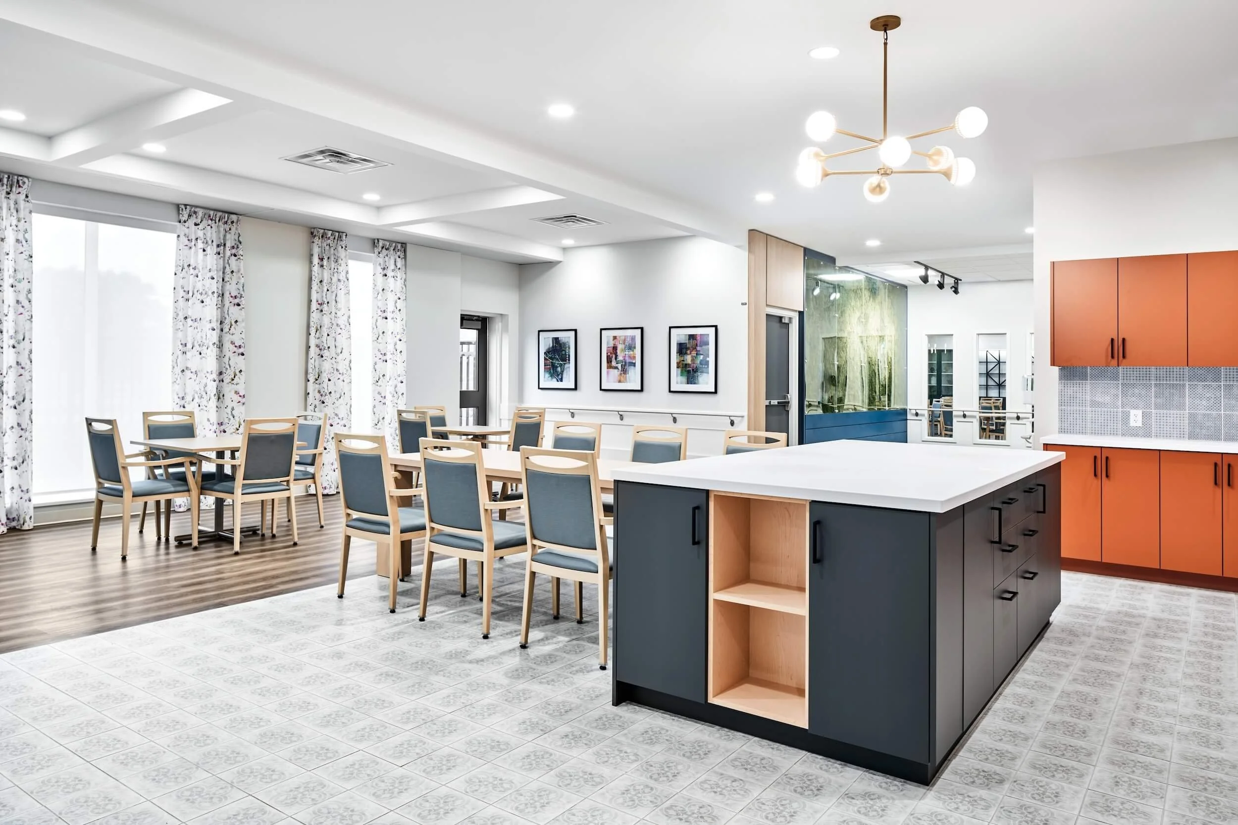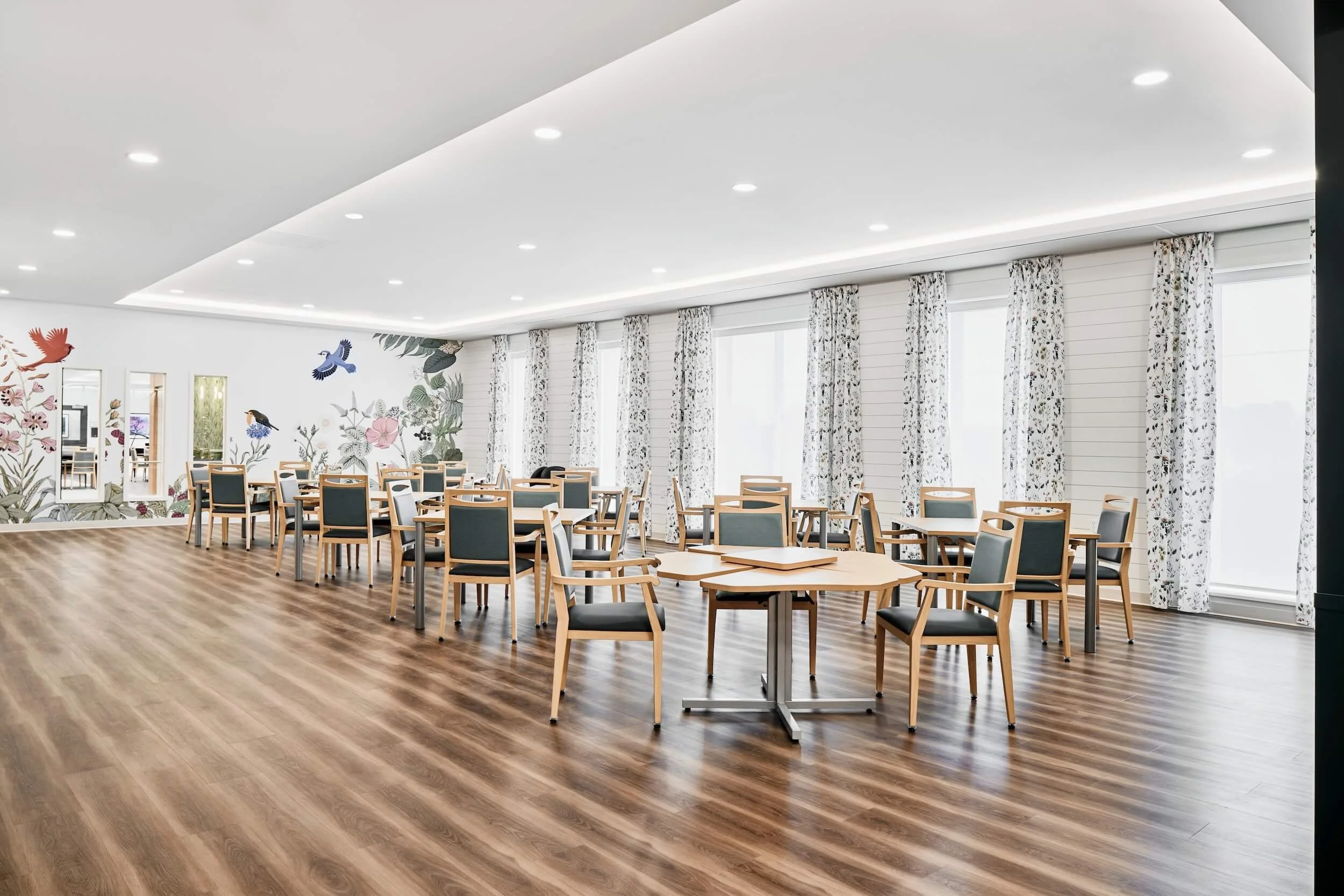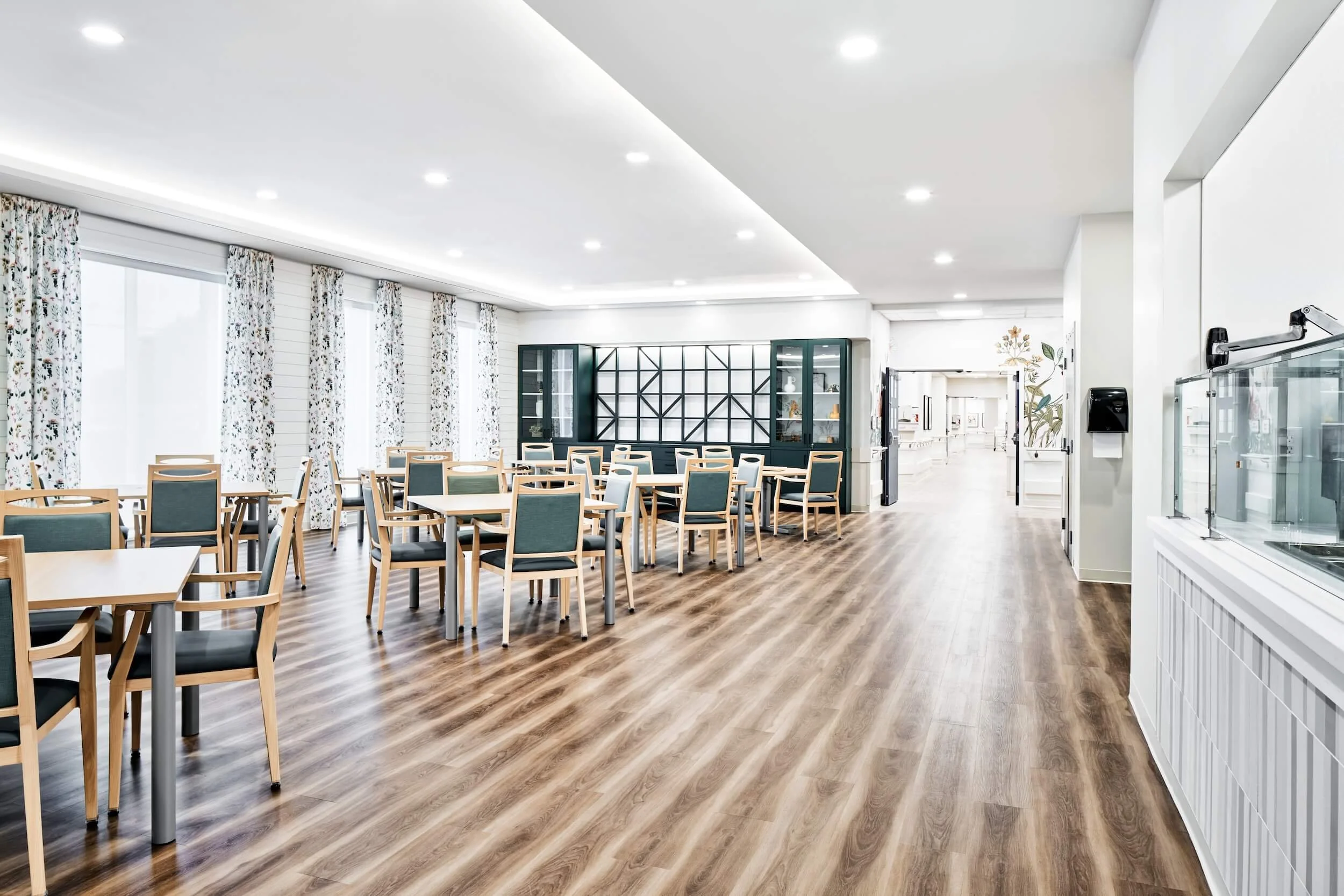 The space is flooded with natural light to provide a warm and inviting atmosphere for residents. The use of vibrant colors contributes to a lively and stimulating environment, fostering a sense of community within the facility. The project aimed to balance the functional requirements of a care facility with the provision of a comforting and homely ambiance.